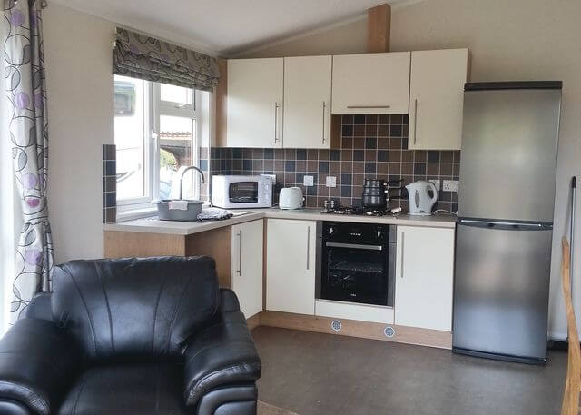 The exterior woodwork of this cabin has been painted in cream, making it stand out from the crowd. There are two spacious bedrooms, one double and one twin-bedded as well as a full bathroom. The spacious open-plan living area has distinct dining and kitchen areas, with the sitting area opening onto a lovely decked outdoor space with seating.