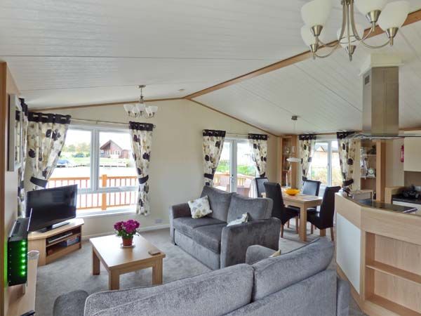 The open plan living area is large and comfortable, with a fitted kitchen, dining area and sitting area with electric fire.