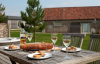 This outside decked terrace is furnished with a table and chairs, perfect for summer dining. There is also a private hot tub and access to a fenced off area for dogs.