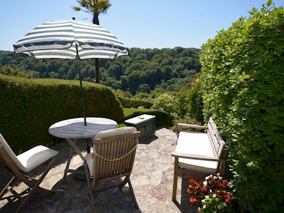 A charming garden, including a patio that is complete with furniture, looks out over the picturesque countryside.
