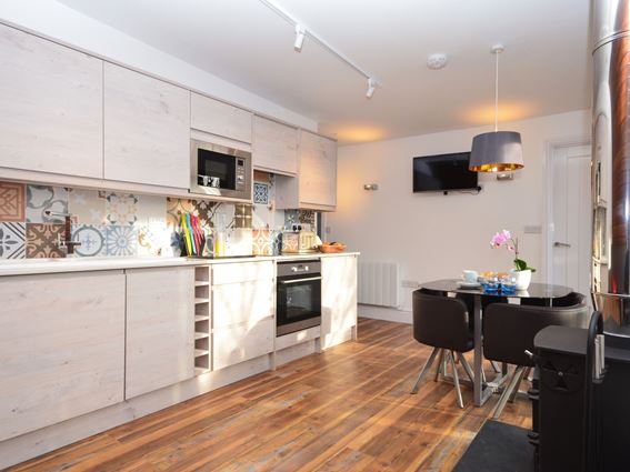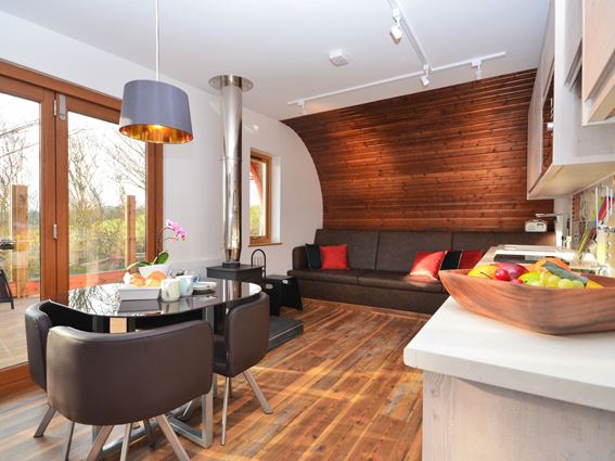 The open plan living area is spacious but cosy, and included a traditional wood burning stove, which is great for chillier evenings. There is also a smart TV and Wi-Fi connection which is great for entertainment when the weather is less than ideal.