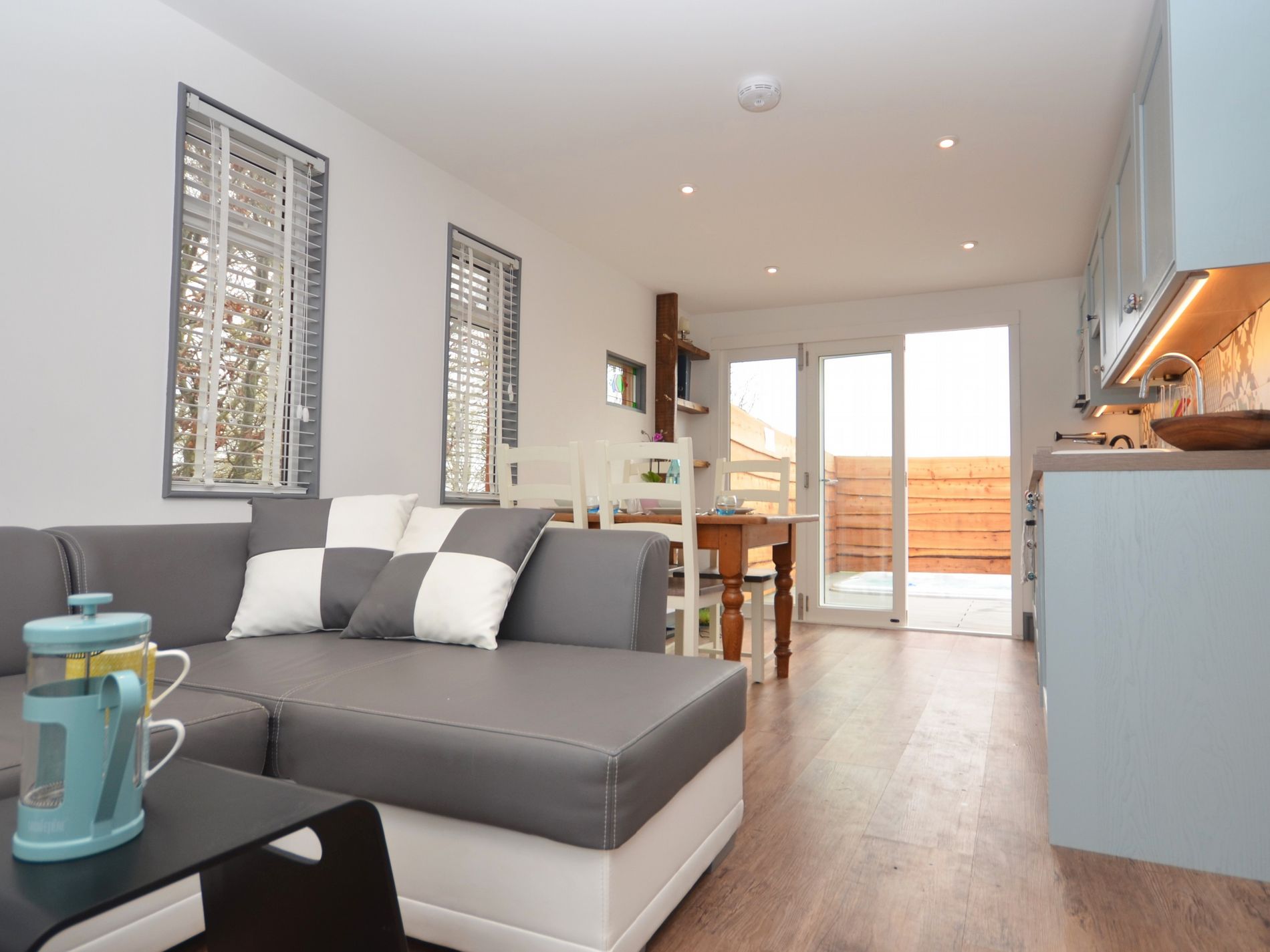 The open plan living area is bright and comfortable. As well as plenty of modern facilities, it has a traditional wood burning stove, which is great for chillier evenings. There is also a smart TV and Wi-Fi connection to provide entertainment when the weather is less than ideal.