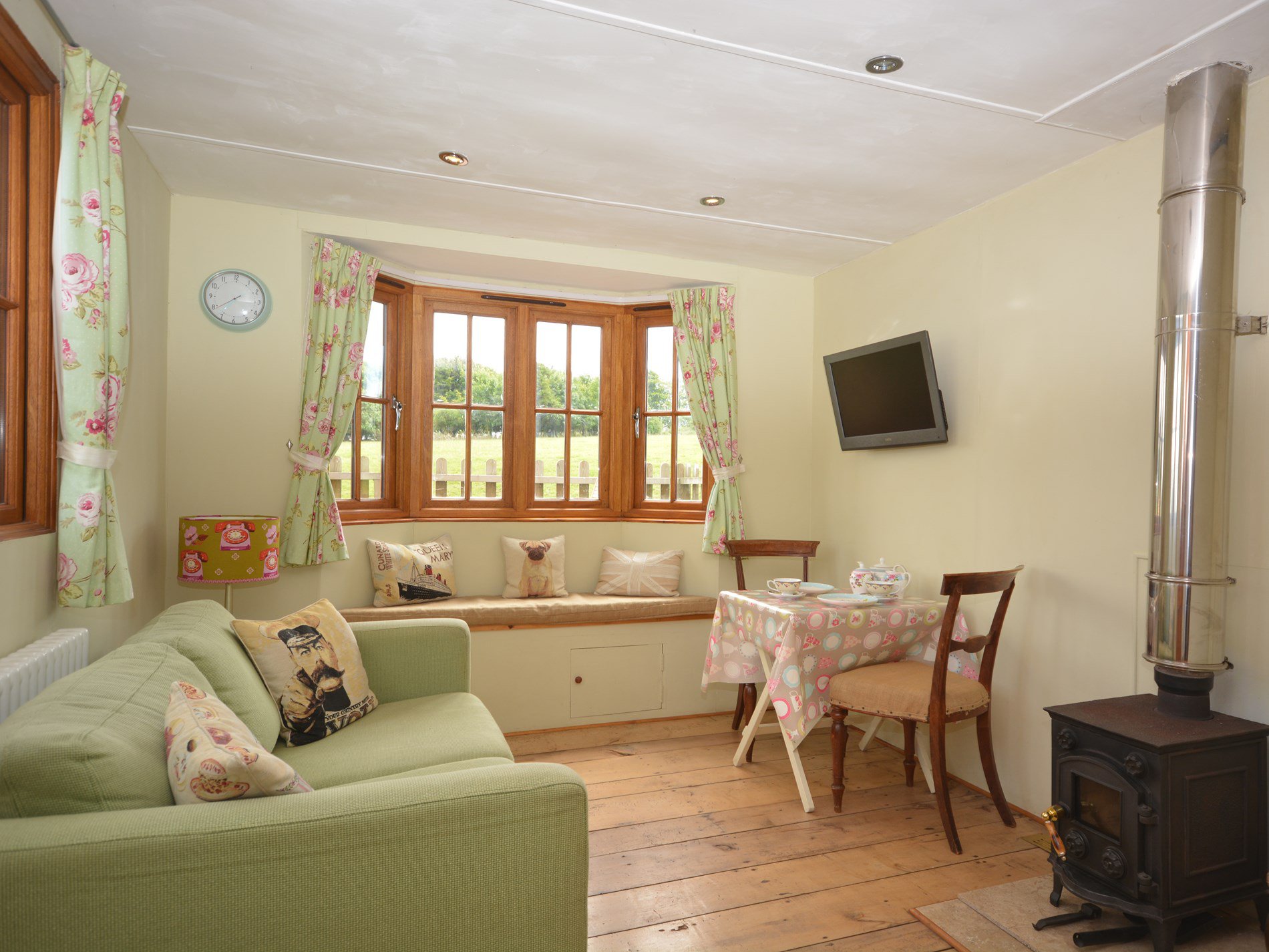 The living area is light, with plenty of windows that really make the most of the beautiful views. It also has a traditional wood burner and comfy sofa, ideal for curling up in on chillier evenings. A wall-mounted TV with Freeview and a DVD player, as well as an iPod dock, ensure that guests will never be short on entertainment, no matter what the weather decides to do.